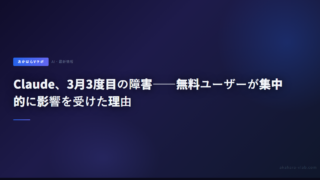 5Claude、3月3度目の障害——無料ユーザーが集中的に影響を受けた理由 2026年3月17日、Anthropicのクロードが今月3度目の障害を記録。無料ユーザーを中心にチャットが使えない状態が続いた。3月に集中した障害の背景と、有料ユーザーへの影響状況をまとめた。 2026.03.175