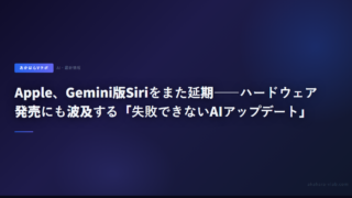 5Apple、Gemini版Siriをまた延期——ハードウェア発売にも波及する「失敗できないAIアップデート」 AppleがGemini搭載の新Siriを再延期。iOS 26.4での導入を断念し、iOS 26.5(5月以降)またはiOS 27(9月)に先送り。スマートホームデバイス「J490」の発売計画にも影響が出ている。 2026.03.175