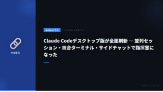 AI・自動化Claude Codeデスクトップ版が全面刷新 — 並列セッション・統合ターミナル・サイドチャットで「指揮室」になった Claude Codeデスクトップアプリが全面刷新。マルチセッションサイドバー、統合ターミナル、プレビューペイン、サイドチャット搭載。並列エージェント時代のUI設計思想を解説。 2026.04.19AI・自動化