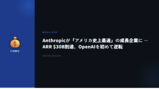 AI・自動化Anthropicが「アメリカ史上最速」の成長企業に — ARR $30B到達、OpenAIを初めて逆転 AnthropicのARRが$30B(約4.6兆円)に到達し、OpenAIを初逆転。Axiosは「アメリカ史上最速の成長企業」と報じた。$1Bから1年で$30Bへの軌跡と、法人顧客1,000社超の内訳を解説します。 2026.04.15AI・自動化