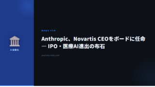 AI・自動化Anthropic、Novartis CEOをボードに任命 — IPO・医療AI進出の布石 Anthropicが製薬大手NovartisのCEO Vas NarasimhanをLong-Term Benefit Trust経由でボードに任命。35以上の新薬承認経験を持つ医療のプロを迎えた戦略的意図と、2026年10月IPOへの影響を解説します。 2026.04.15AI・自動化