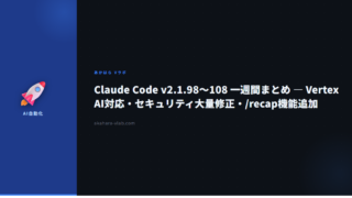 AI・自動化Claude Code v2.1.98〜108 一週間まとめ — Vertex AI対応・セキュリティ大量修正・/recap機能追加 Claude Code直近1週間(v2.1.98〜108)の全変更点を解説。Vertex AIウィザード、サブプロセスサンドボックス、/recap・/team-onboarding新設、セキュリティ修正8件など開発者が押さえるべきポイントをまとめます。 2026.04.15AI・自動化