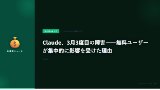 5Claude、3月3度目の障害——無料ユーザーが集中的に影響を受けた理由 2026年3月17日、Anthropicのクロードが今月3度目の障害を記録。無料ユーザーを中心にチャットが使えない状態が続いた。3月に集中した障害の背景と、有料ユーザーへの影響状況をまとめた。 2026.03.175
