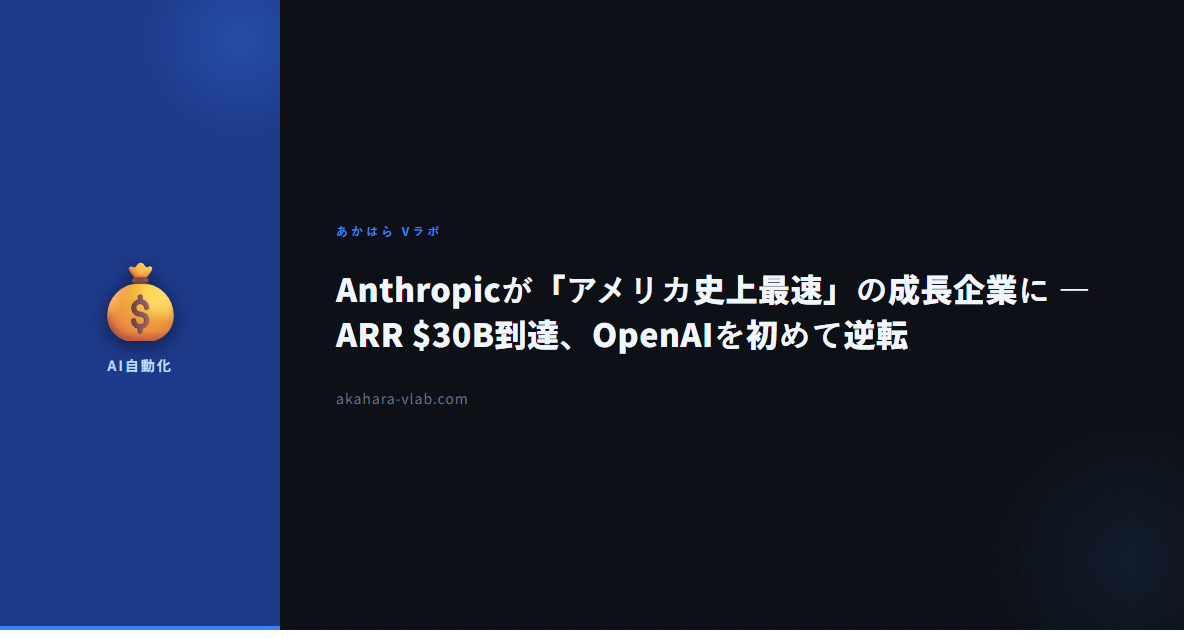 この記事でわかること– Anthropicが「アメリカ史上最速の成長企業」と評される理由 – ARR $30B(約4.6兆円)到達までの時系列 – OpenAIとの収益逆転の構造的背景 – Fortune 10の8社が導入済みの法人顧客基盤 – 2026年10月IPOに向けた動き