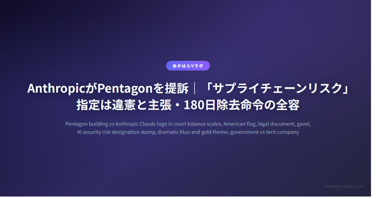 Anthropicが2026年3月9日、米国防総省(Pentagon)を連邦裁判所に提訴しました。「自律兵器・市民監視への不使用」という倫理ポリシーが「サプライチェーンリスク」に指定される原因となったとして、その指定の取り消しを求める2件の訴訟を起こしています。