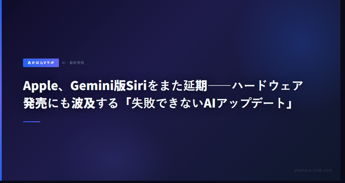 AppleのGemini搭載Siriアップデートが、またしても延期になりました。iOS 26.4(3月リリース予定)での新機能導入を断念し、iOS 26.5(5月以降)かiOS 27(9月)への先送りが固まりつつあります。そして今回の遅延は、AIソフトウェアの問題にとどまらず、ハードウェア製品の発売計画にも直撃し始めています。