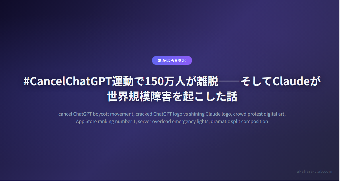 AIの世界って、週一ペースでとんでもないニュースが飛び込んでくるよね。今週もやってくれたよ。「#CancelChatGPT」っていうボイコット運動が一気に燃え上がって、その余波でClaudeまで障害を起こすという、なんというか……AIニュース的には最高にドラマチックな展開になったんだ。