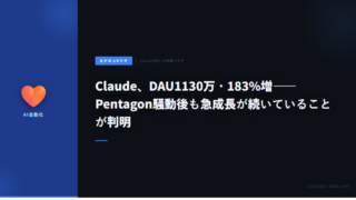 5Claude、DAU1130万・183%増——Pentagon騒動後も急成長が続いていることが判明 TechCrunch報道によりClaudeの3月2日時点のDAUが1130万、前年比183%増であることが判明。日次ダウンロード数はChatGPTを上回る149,000件。毎日100万人がサインアップ。Pentagon騒動が逆に消費者支持を後押し。 2026.03.115