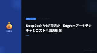 5DeepSeek V4が間近か – Engramアーキテクチャとコスト半減の衝撃 DeepSeekがV4リリースに向けて静かに動き出している。Engramアーキテクチャの静的メモリ分離とDSAによるコスト50%削減の仕組みを解説。前回V3でNasdaq暴落を引き起こした市場への影響も考察。 2026.03.115