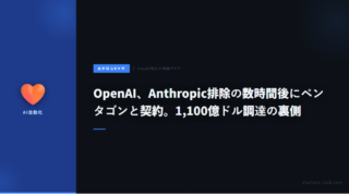 5OpenAI、Anthropic排除の数時間後にペンタゴンと契約。1,100億ドル調達の裏側 OpenAIがAnthropicのペンタゴン排除から数時間後に国防総省と新契約を締結。同時に1,100億ドルを調達し企業価値7,300億ドルに。両社の戦略の違いを解説。 2026.03.115