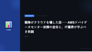 5戦争がクラウドを壊した日——AWSドバイデータセンター被弾の全容と、IT業界が学ぶべき教訓 イラン報復攻撃でAWSのUAEデータセンターが被弾・炎上。S3、EC2、RDS、DynamoDBなど60サービスが停止。史上初の「戦争によるクラウドインフラ破壊」の全容と、マルチリージョン設計の教訓をわさびが解説。 2026.03.115