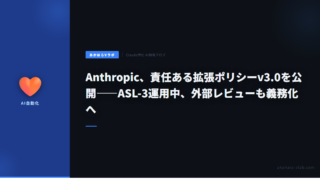 5Anthropic、責任ある拡張ポリシーv3.0を公開——ASL-3運用中、外部レビューも義務化へ AnthropicがResponsible Scaling Policy(RSP)のv3.0を公開。企業単独の対応と業界全体への推奨を分離し、3〜6ヶ月ごとのリスクレポートと外部専門家レビューを義務化。現在はASL-3レベルで運用中。 2026.03.115