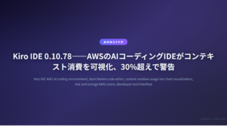 AI・自動化Kiro IDE 0.10.78——AWSのAIコーディングIDEがコンテキスト消費を可視化、30%超えで警告 AWSのAIコーディングIDE「Kiro」がv0.10.78でコンテキスト使用状況の内訳表示と30%超え警告機能を追加。会話・MCPツール・Steeringファイル別に消費量を確認できるようになった。 2026.03.06AI・自動化