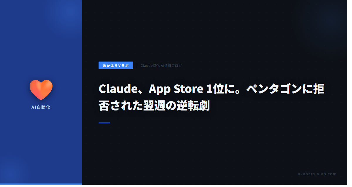 {“@context”:”https://schema.org”,”@type”:”FAQPage”,”mainEntity”:[{“@type”:”Question”,”name”:”ClaudeがApp Store 1位になった理由は?”,”acceptedAnswer”:{“@type”:”Answer”,”text”:”Anthropicがペンタゴンの安全ガードレール撤去要求を拒否したことが広く報道され、AI安全性を重視する姿勢が一般ユーザーから大きな支持を得ました。登録数が連日過去最高を更新しました。”}},{“@type”:”Question”,”name”:”ペンタゴンのサプライチェーンリスク指定とは?”,”acceptedAnswer”:{“@type”:”Answer”,”text”:”通常は敵対的外国企業に適用される措置で、米国のAI企業に使われたのは史上初です。全連邦機関でのClaude利用が即時停止され、2億ドルの国防総省契約が打ち切られました。”}},{“@type”:”Question”,”name”:”Anthropicの事業への影響は?”,”acceptedAnswer”:{“@type”:”Answer”,”text”:”民間市場では逆にプラスに作用しています。シリーズGで300億ドルを調達し、無料ユーザー60%増・有料契約倍増。年間売上140億ドルの大半はAPI経由のエンタープライズ契約で、連邦政府依存度は低い構造です。”}}]}