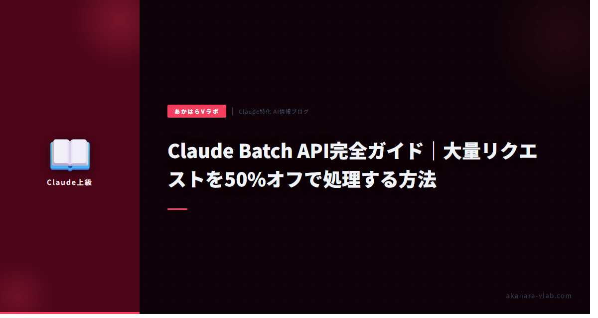 Batch APIはClaude APIのコストを本気で下げる神機能だ。わさびは2025年12月からClaude Codeを使い始めて、akahara-vlabの自動化パイプラインで224記事以上を生成したが、通常のMessages APIだとAPI料金がネックになっていた。carasiAIのRSS要約処理で1日数百件のリクエストを回すようになり、Batch APIを導入したら即50%オフで安定。夜間にバッチを投げて朝に結果を拾うだけで、月間コストが3割以上削減された。