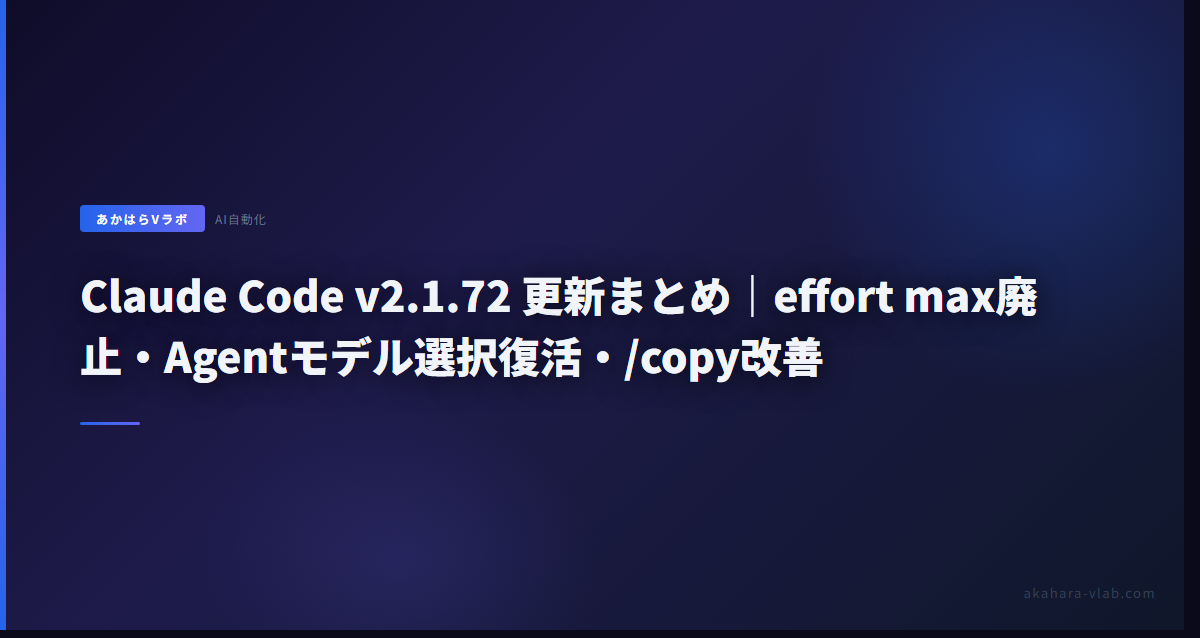 わさびです。Claude Code v2.1.72の更新、自動化パイプラインを回している身として即チェックしました。effort max廃止は痛手ですが、akahara-vlabの224記事自動生成スクリプトでmax依存ゼロ運用だったのでセーフ。念のためsedで全プロジェクト一括置換し、highで品質維持を確認済み。highで十分高速・高品質だ。