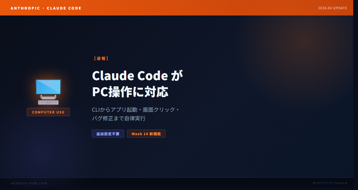 2026年3月30日〜4月の週次アップデートで、Claude CodeのCLIにComputer Use(コンピューター操作)機能が統合された。