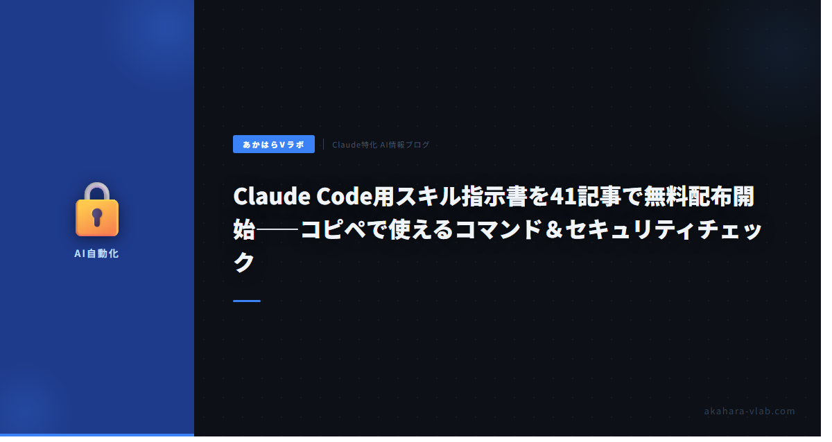 あかはらVラボの41記事でClaude Code用スキル指示書の無料配布を開始。コマンド指示書27件とセキュリティチェック14件を、平文Markdownで安全に提供します。