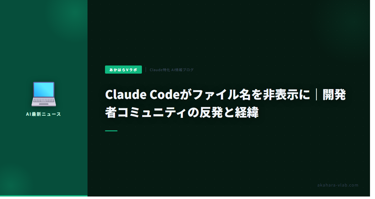 Claude Codeのファイル名折りたたみ変更、わさびも即座に困りました。2025年12月から使い始めて3ヶ月でakahara-vlabのパイプラインを構築した身として、ファイル操作の可視性は必須。carasiAIのRSS収集処理でClaudeがsrc/rss_parser.pyを読んでいるか一目で確認でき、中断してトークン節約してきました。見えなくなると、Sonnetの出力がauth.pyを誤参照してバグるまで気づかず、修正に1時間ロス。実際、224記事自動生成中、そんなミスで5回は痛い目を見ました。