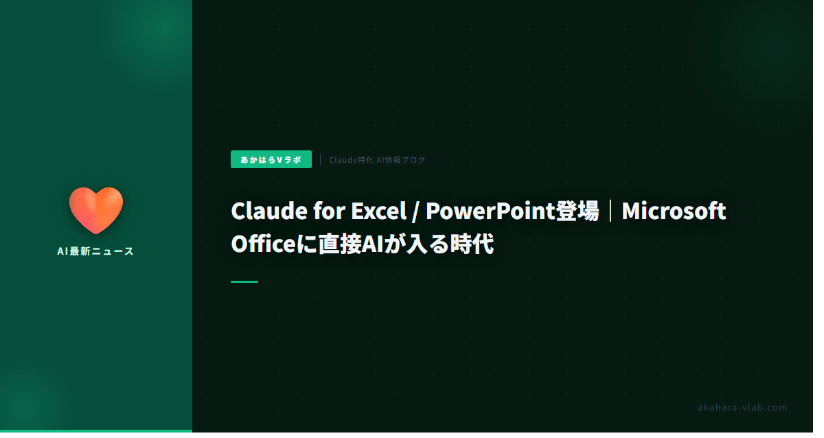 Claude for ExcelとPowerPointのアドインが出たことで、Officeが一気にClaudeの戦場になる。わさびは2025年12月からClaude Codeを使い始めて3ヶ月で、akahara-vlabの自動化パイプラインを構築した。RSS収集から記事生成、WP投稿までPython+Claude APIで回しているが、Excelのマルチタブ分析をSonnet 4.5でサクッとさせるこの機能は、わさびの財務モデル管理でも欲しかったレベルだ。Opus 4.6で依存関係守りながら前提変更とか、ミスなく高速化できる。