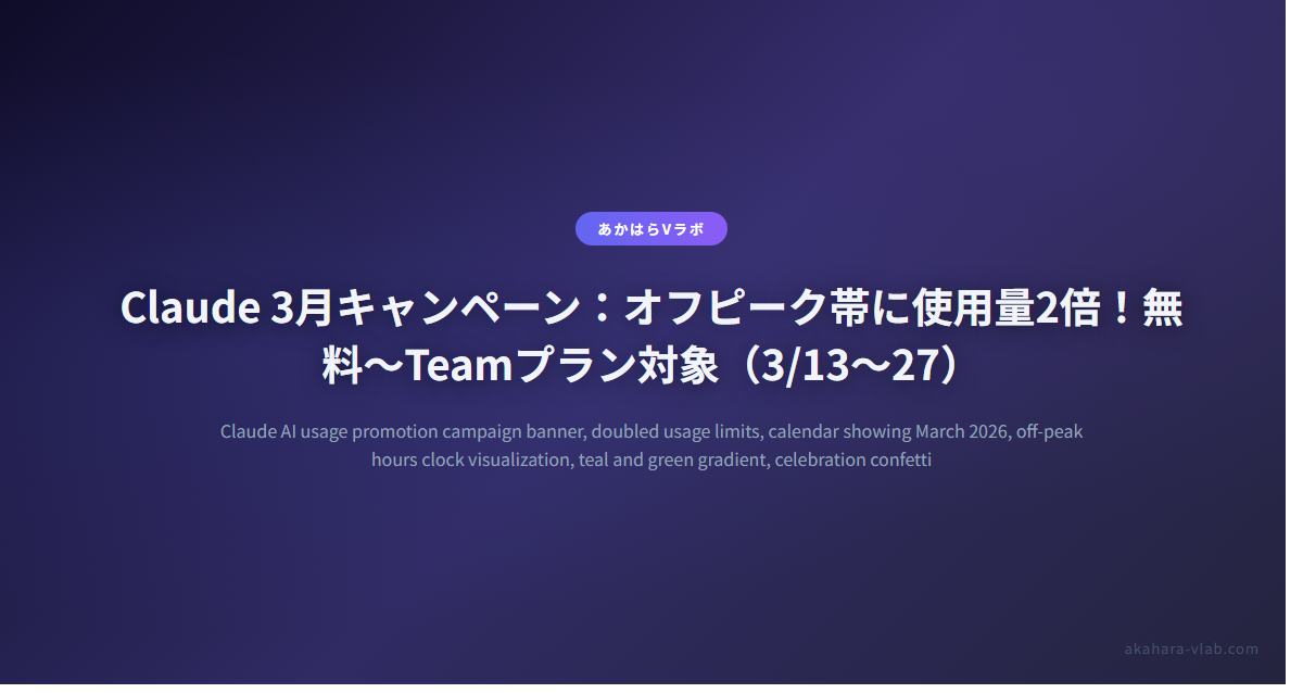 わさびです。このClaude 3月キャンペーン、わさびのClaude Codeヘビーユース生活に完璧にハマる。2025年12月から使い始めて約3ヶ月、akahara-vlabの自動化パイプラインを構築し、224記事以上を全自動生成・投稿するまでになったわさびにとって、オフピーク2倍は神アプデだ。日本時間の日中〜夕方が対象だから、普段のコーディングタイムが丸ごと倍増。Sonnetで日常タスクを回し、Opusだけ複雑設計に絞る運用がさらに加速する。