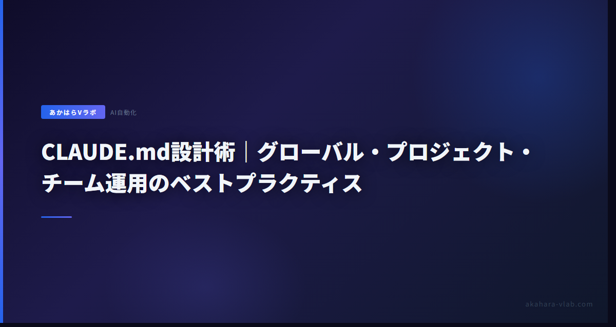 わさびです。Claude Codeを2025年12月から使い始めて3ヶ月で10以上のプロジェクトを回すようになり、CLAUDE.mdなしでは無理でした。最初、akahara-vlabの自動化パイプラインで毎回「Python 3.13、WP-CLI経由でREST API叩け」と繰り返していましたが、グローバル~/.claude/CLAUDE.mdに環境情報とlintルールを書いて一発解決。以降の会話でClaudeが自動参照するので、思考の無駄がゼロに。