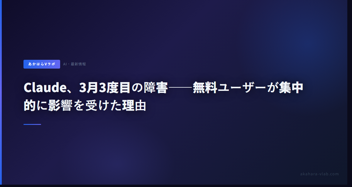 急成長フェーズのAIサービスでは、インフラスケールアップが需要増加に遅れるケースが多く見られます。Anthropicは現在インフラ増強を優先投資していると報じられていますが、3月はその移行期に当たっていたと考えられます。