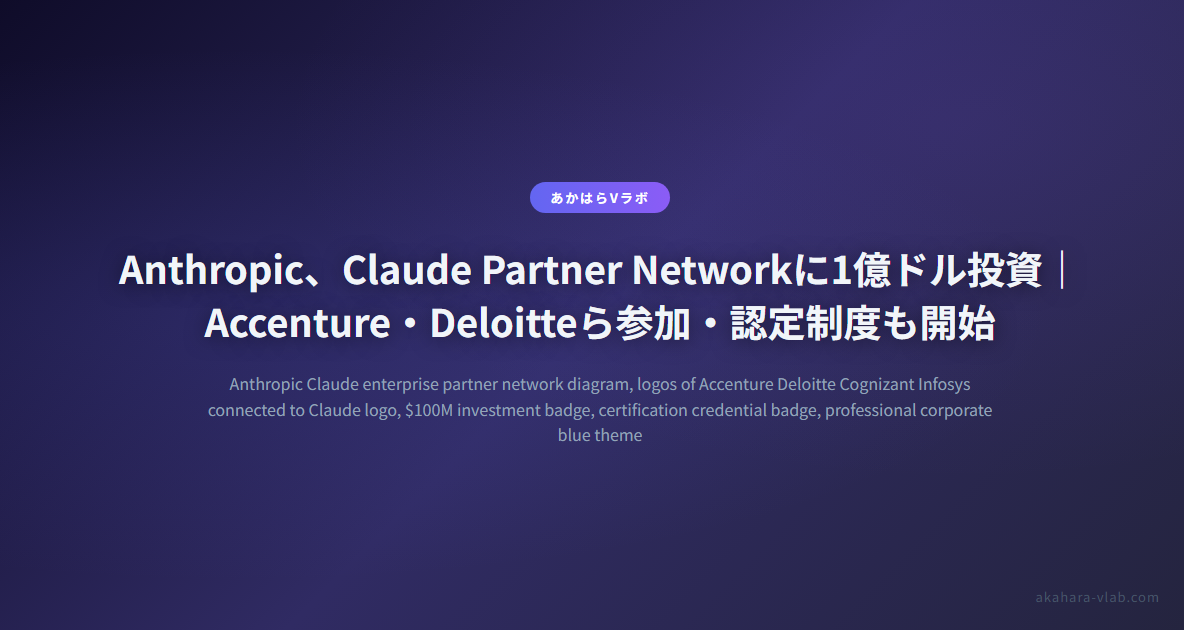 Anthropicは2026年3月12日、Claude Partner Networkの正式発足と1億ドルの初期投資を発表しました。Accenture・Deloitte・Cognizant・Infosysら大手コンサルティングファームが参加し、エンタープライズ向けClaude普及の本格攻勢が始まりました。