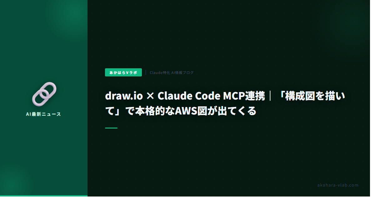 わさびです。draw.io MCPのClaude Code連携、実際にTerraformからAWS構成図を生成してみた。わさびのakahara-vlabパイプラインで、carasiAIのRSS収集フローを図化するのに使ってみたら、指示だけでVPCやEC2の配置が完璧に揃った。手描きなら20分かかるのが、3分で編集可能ファイルが出てくる。2025年12月からClaude Codeを使い始めて、MCPのHooksと組み合わせるのが鉄板だと確信した。