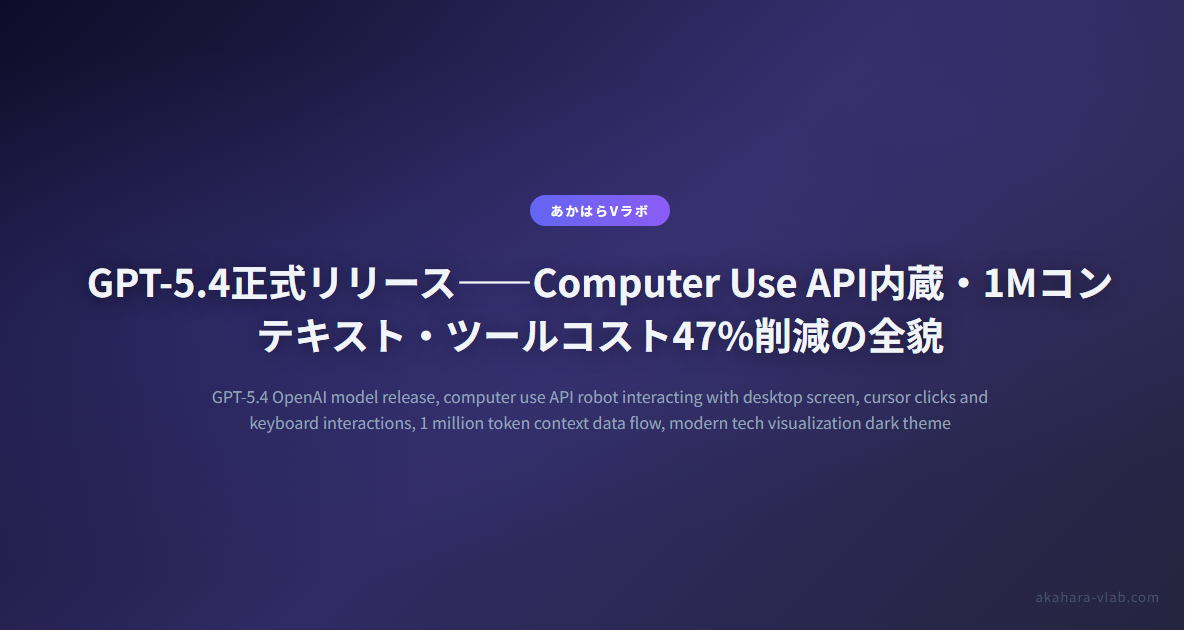 OpenAIは2026年3月5日、GPT-5.4を正式リリースした。ChatGPT(GPT-5.4 Thinking)・API(gpt-5.4)・Codexに同時展開され、汎用モデルとして初めてComputer Use APIをビルトインした点が最大の特徴だ。1Mトークンコンテキスト、ツール検索による47%コスト削減、中間修正(Mid-Response Course Correction)など、エージェント利用を強く意識した仕様が並ぶ。