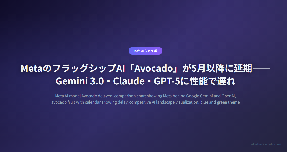 Metaの次世代フラッグシップAIモデル(コードネーム「Avocado」)が、当初の2026年3月リリース予定から5月以降に延期されました。内部テストでGemini 3.0・OpenAI・Anthropicの最新モデルに性能で劣ることが判明したためです。Fortuneなどが3月13日に報道しました。