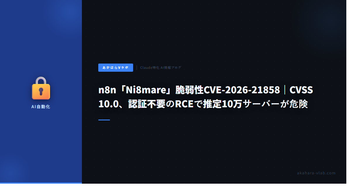 わさびです。n8nのNi8mare脆弱性、CVSS10.0で10万サーバー影響は衝撃的だ。わさび自身、akahara-vlabのパイプラインでRSS収集からClaude API、WordPress投稿まで全自動化しているが、n8nのようなノーコードツールは魅力的でもセルフホストの罠にハマりやすい。
