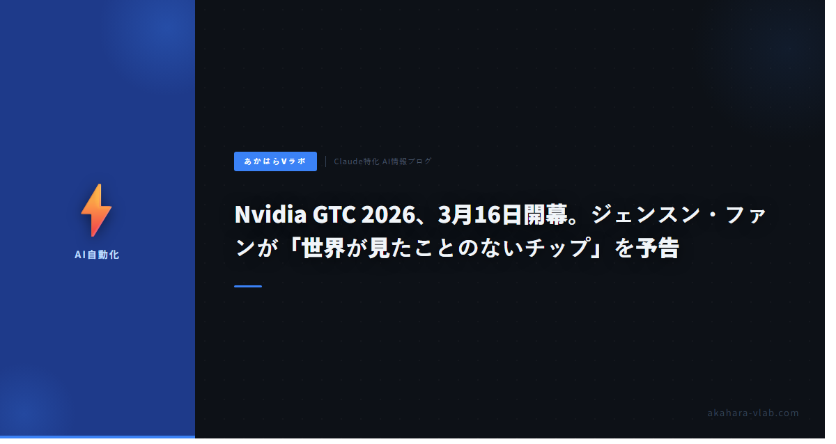 {“@context”:”https://schema.org”,”@type”:”FAQPage”,”mainEntity”:[{“@type”:”Question”,”name”:”Nvidia GTC 2026の開催日程は?”,”acceptedAnswer”:{“@type”:”Answer”,”text”:”2026年3月16日から19日まで、サンノゼ(対面)とオンラインのハイブリッド形式で開催されます。オンライン参加は無料で、基調講演もライブ配信されます。”}},{“@type”:”Question”,”name”:”GTC 2026で何が発表される?”,”acceptedAnswer”:{“@type”:”Answer”,”text”:”ジェンスン・ファンCEOが「世界が見たことのないチップ」を予告しています。AI推論特化チップ、エージェントAI開発ツール、フィジカルAI(ロボット・自動運転)の発表が見込まれています。”}},{“@type”:”Question”,”name”:”Nvidiaの推論チップがAI業界に与える影響は?”,”acceptedAnswer”:{“@type”:”Answer”,”text”:”LLMの推論コスト削減はAI業界最大の課題です。推論特化チップで性能が向上すれば、AIサービスの運用コストが下がり、より多くの企業がAIを実用化できるようになります。”}}]}