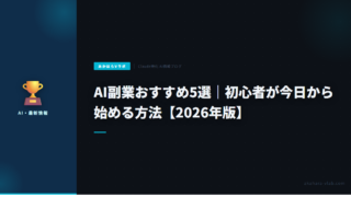AI・自動化AI副業おすすめ5選|初心者が今日から始める方法【2026年版】 AI副業の始め方を初心者向けに解説。画像生成・ライティング・動画編集・プロンプト販売・プログラミング代行の5つを紹介。必要なツールと始め方を具体的にまとめました。 2026.02.12AI・自動化