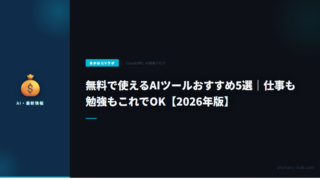 AI・自動化無料で使えるAIツールおすすめ5選|仕事も勉強もこれでOK【2026年版】 2026年最新の無料AIツールを5つ厳選して紹介。ChatGPT・Gemini・Claude・Copilot・Perplexityの特徴と使い分けを初心者向けに解説します。 2026.02.15AI・自動化