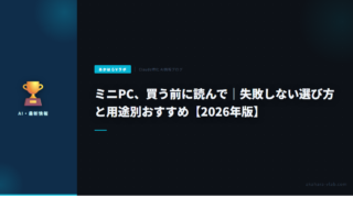ガジェットミニPC、買う前に読んで|失敗しない選び方と用途別おすすめ【2026年版】 ミニPCの選び方を用途別に解説。仕事用・プログラミング・動画編集まで、CPU・メモリ・ストレージの目安と注意点を正直にまとめました。2026年最新。 2026.02.16ガジェット