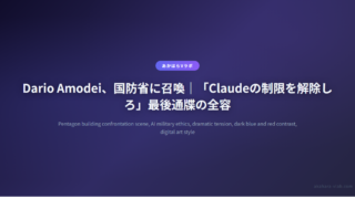 AI・自動化Dario Amodei、国防省に召喚|「Claudeの制限を解除しろ」最後通牒の全容 米国防長官HegsethがAnthropicのDario Amodei CEOを国防省に召喚。Claudeの軍事利用制限を解除しなければサプライチェーンリスクに指定すると最後通牒。 2026.02.24AI・自動化