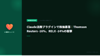 AI・自動化Claude法務プラグインで株価暴落|Thomson Reuters -16%、RELX -14%の衝撃 Anthropicの法務プラグイン発表でリーガルテック株が暴落。Thomson Reuters -16%、RELX -14%。何が起きたか事実ベースで解説。 2026.02.17AI・自動化