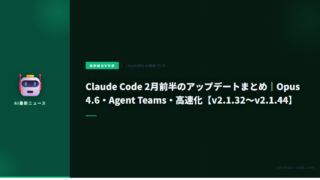 AI・自動化Claude Code 2月前半のアップデートまとめ|Opus 4.6・Agent Teams・高速化【v2.1.32〜v2.1.44】 Claude Code 2026年2月前半(v2.1.32〜v2.1.44)の変更点を開発者向けに解説。Opus 4.6対応、Agent Teams、Fast Mode、安定性修正など。 2026.02.17AI・自動化